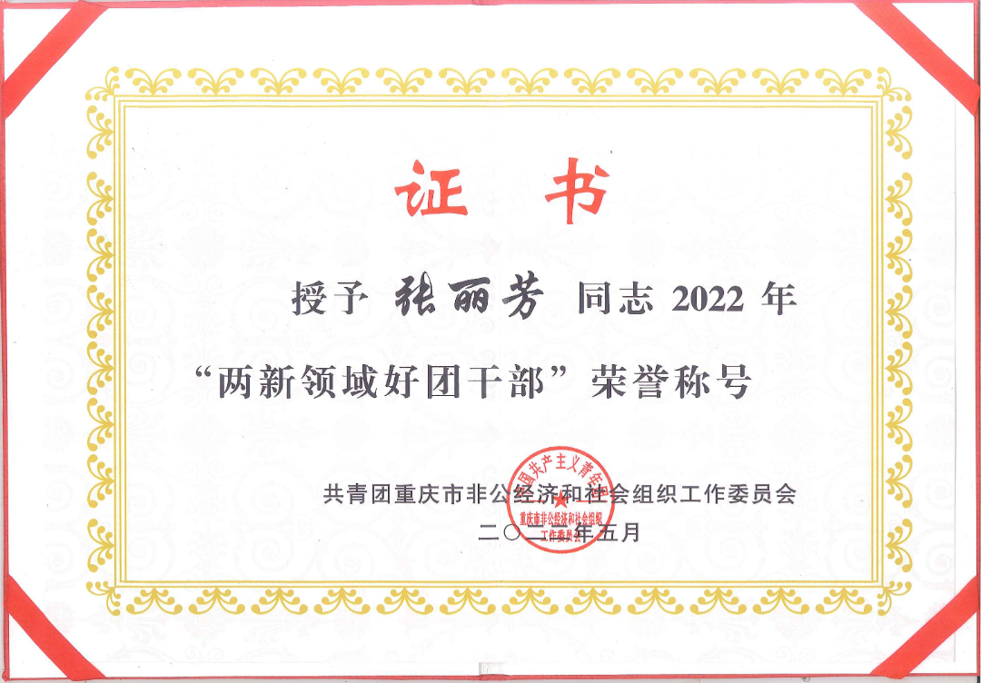 为充分发挥先进典型示范引领作用,喜迎党的二十大胜利召开,庆祝中国共产主义青年团成立100周年,重庆市非公经济和社会组织团工委开展了2022年“两新领域五四红旗团委(团支部)”“两新领域好团员”“两新领域好团干部”选树工作。suncitygroup太阳官方网站团支部书记张丽芳同志荣获重庆市“两新领域好团干部”荣誉称号。