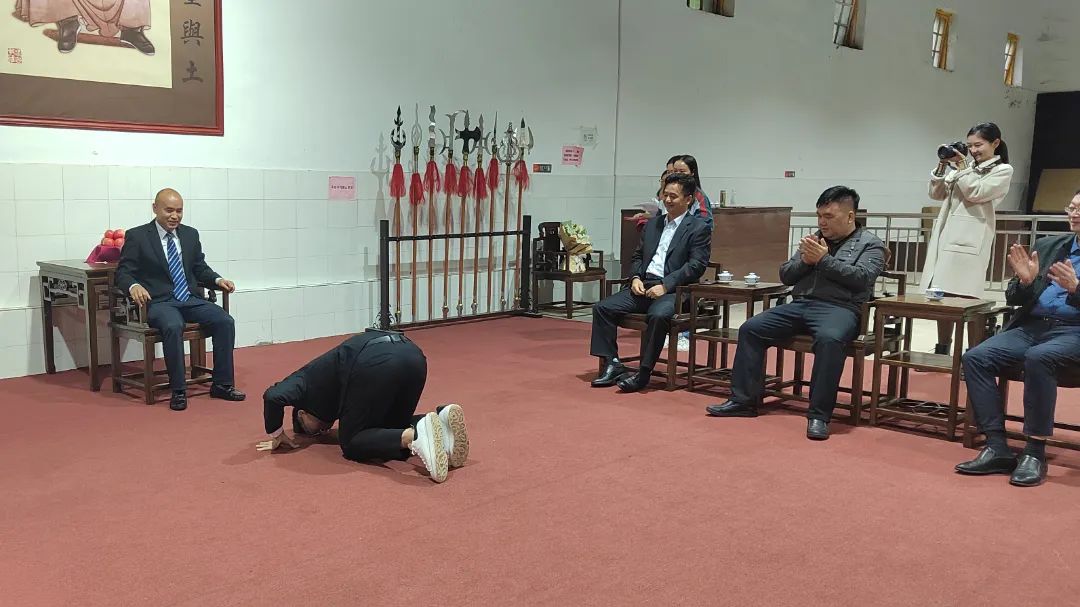 随后,suncitygroup太阳官方网站集团董事长刘斌作为刘洋诚拜的师傅上台,正坐在拜师椅上,弟子刘洋行拜师礼,师傅刘斌还礼后,刘洋拿出拜师帖,高声读出了拜师之诚意,双手高举拜师帖敬呈给师傅刘斌,随后呈上了拜师茶与鲜花,师傅刘斌高兴地接过拜师茶与鲜花,为徒弟送上了美好的祝愿。