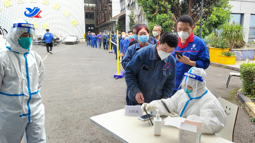 “请全体员工立即到中庭进行核酸检测,按要求规范佩戴口置,有序排队并保持安全距离。”接到指令后各部门负责人立即组织部门员工按规定在厂区内开展核酸检测,确保所有人员应检尽检、不漏一人。