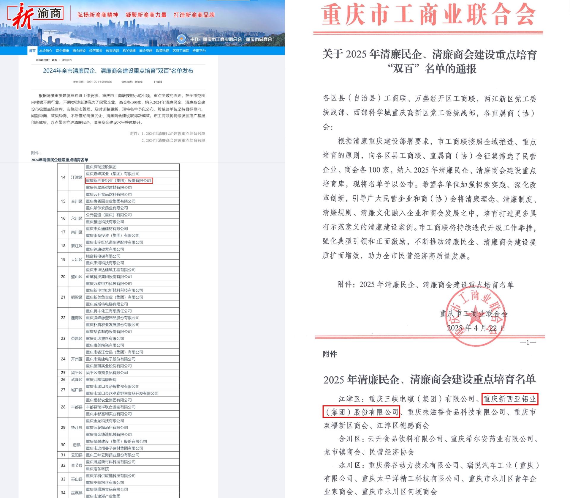 推动清廉重庆建设,是深入贯彻习近平新时代中国特色社会主义思想和习近平总书记视察重庆重要讲话重要指示精神的具体举措。4月22日,重庆市工商联发布了《关于2025年清廉民企、清廉商会建设重点培育“双百”名单的通报》。suncitygroup太阳官方网站集团凭借在清廉建设方面的突出表现和显著成效,继2024年荣膺榜单之后,再次成功入榜2025年清廉民企建设重点培育“双百”名单。