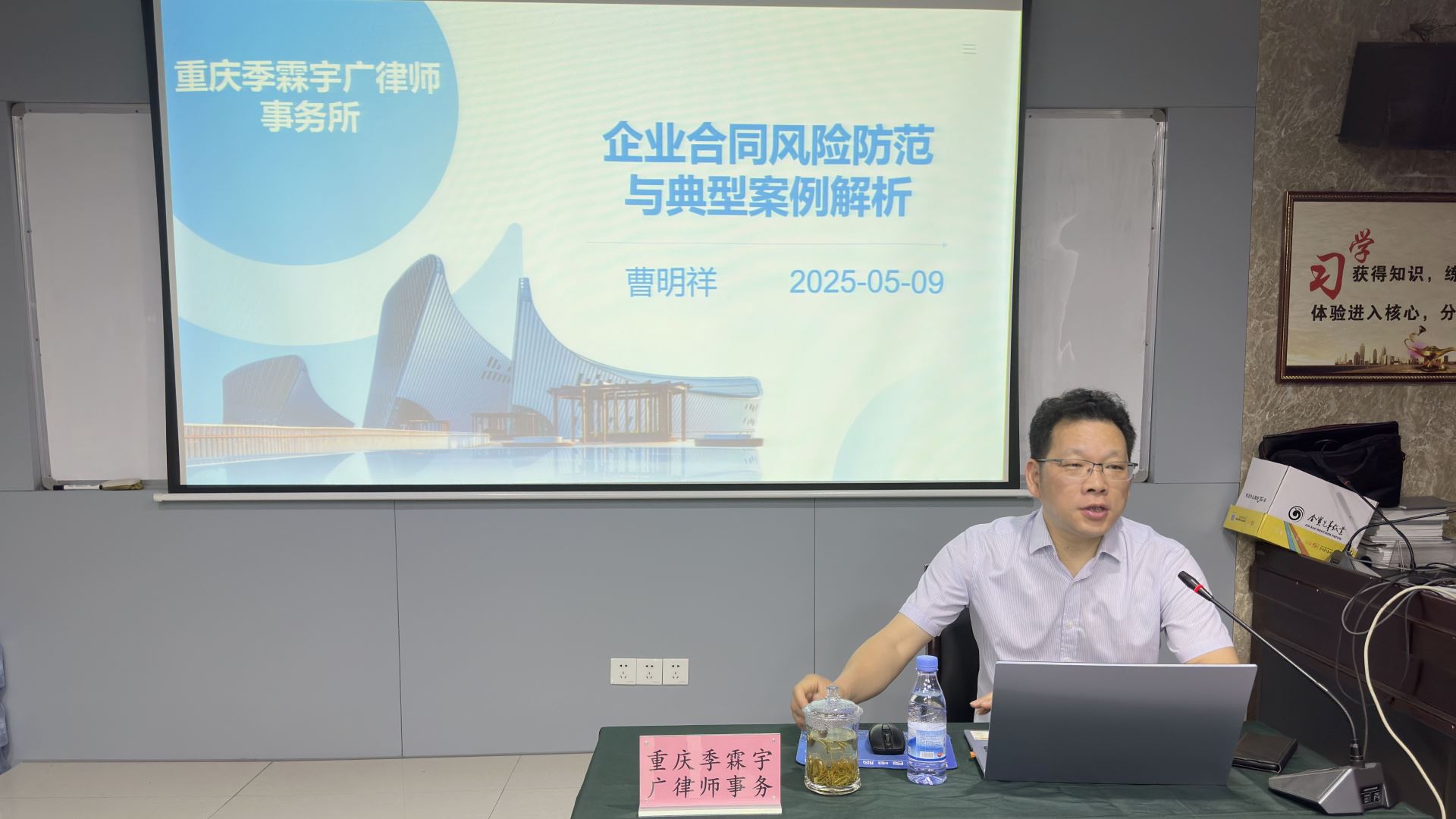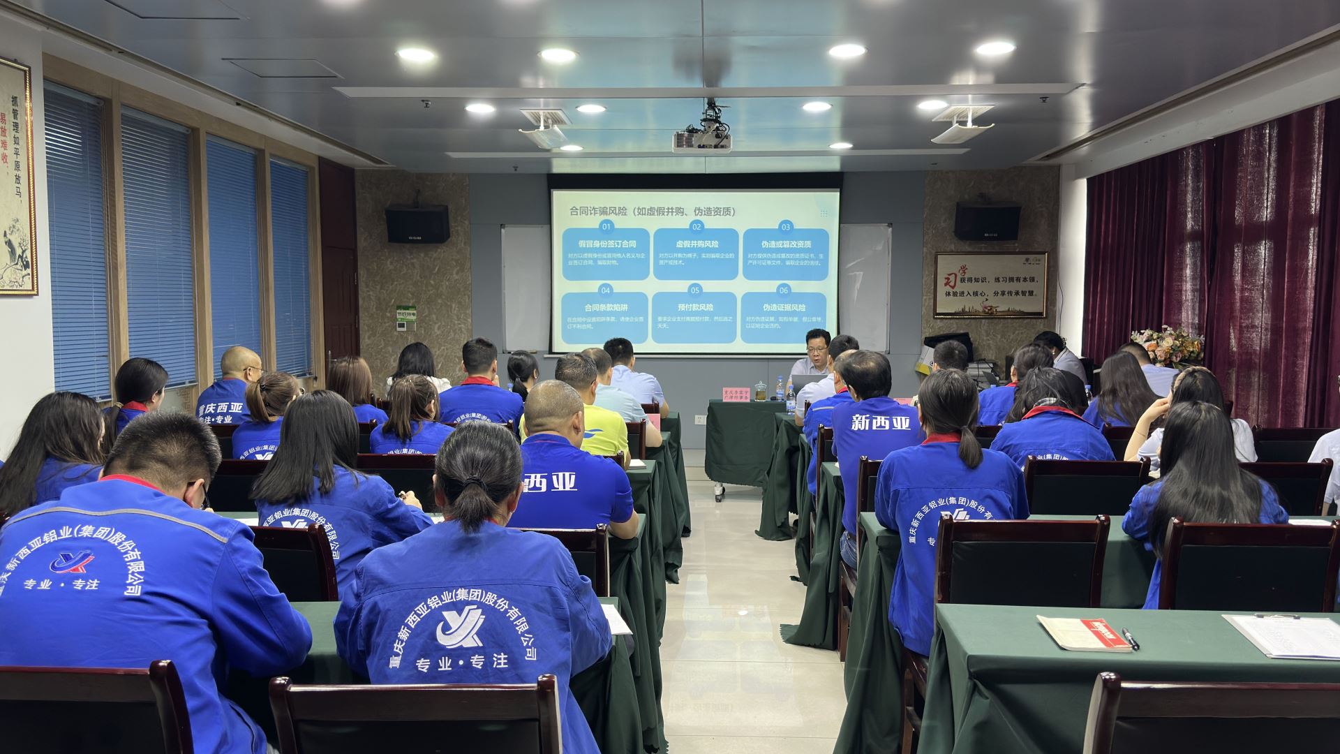 活动当日,重庆季霖宇广律师事务所主任曹明祥以 “以法助企・护航发展”为主题,结合suncitygroup太阳官方网站实际情况,开展了《企业合同风险防范与典型案例解析》专题法治宣讲。宣讲活动由公司总经理助理周雄主持,公司经营负责(管理)负责人以及员工代表共计 40 余人参加,涵盖生产、销售、人力等关键部门负责人及一线员工代表。曹主任聚焦制造业特点,剖析典型合同纠纷及劳动用工案例,着重讲解风险识别、防范策略及民法典关键条款,助力企业提升依法维权与风险防控能力。