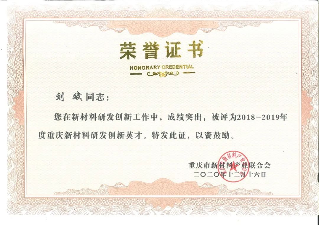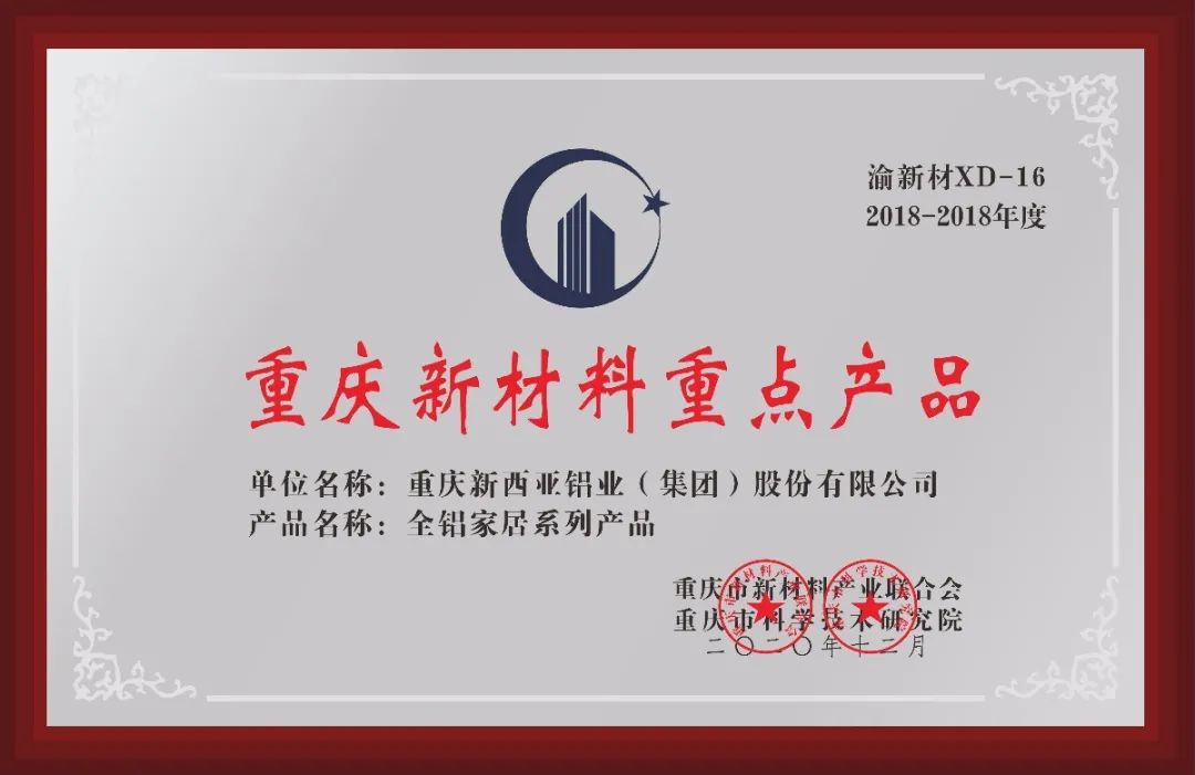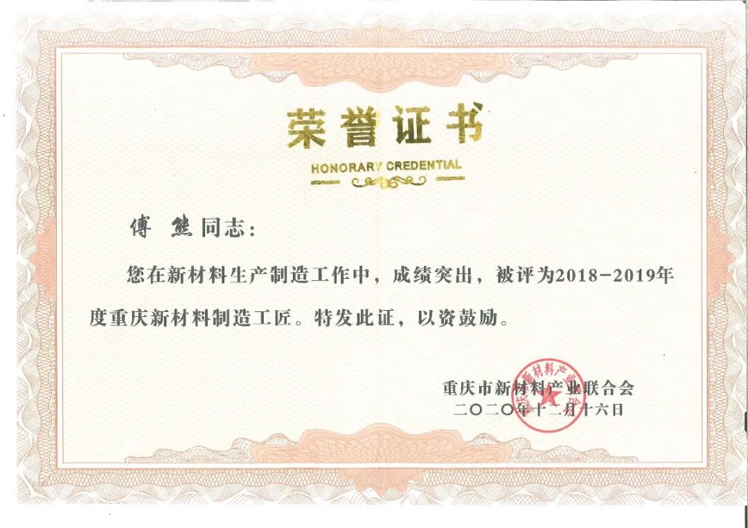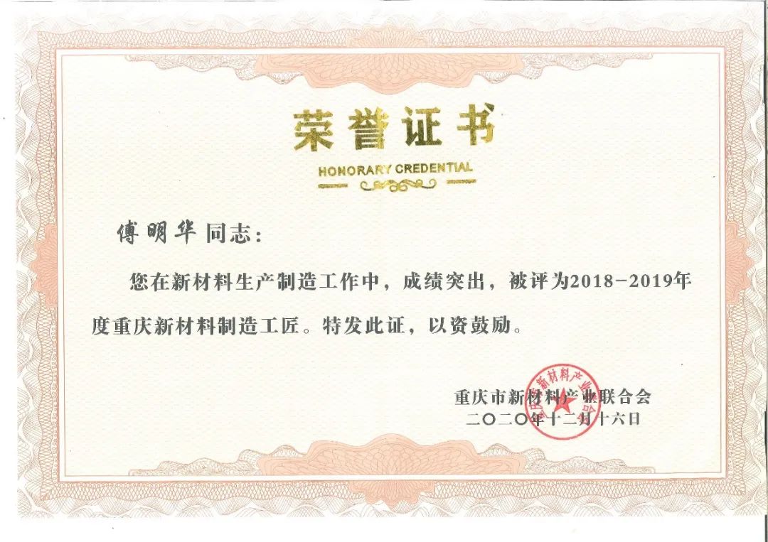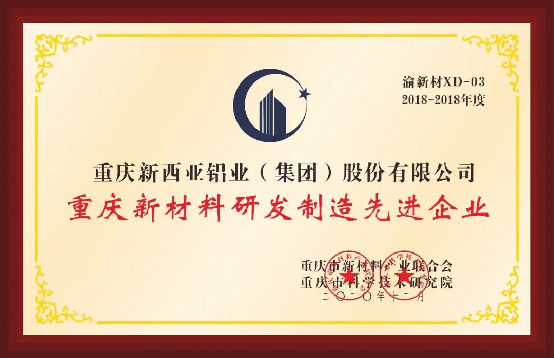 重庆suncitygroup太阳官方网站集团荣获2018-2019年度“重庆新材料研发制造先进企业”“重庆新材料重点产品”,集团公司总经理刘斌荣获“重庆市新材料研发创新英才”,铝装饰事业部执行总经理傅明华、生产部主管傅熊荣获“新材料制造工匠”。