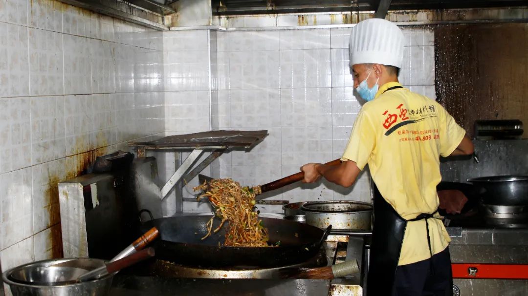 在厨房里靠近火焰的灶台边,温度竟高达50℃!食堂工作人员穿着工作服,戴着口罩,在烟与火的战场上,用自己的汗水,奏响后厨锅碟盆勺的交响曲,在高温炉炼狱中,每日坚持给大家烹饪可口的饭菜。