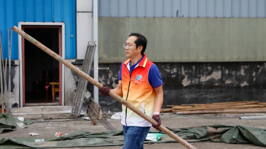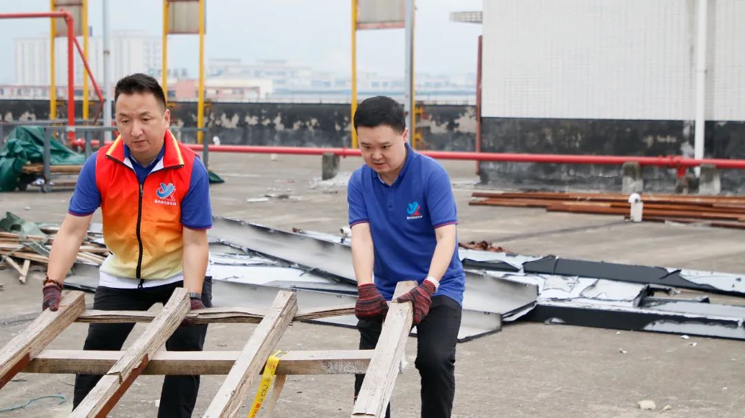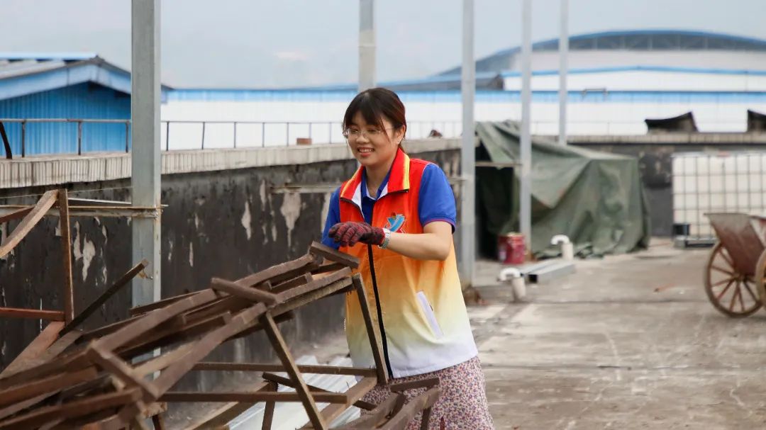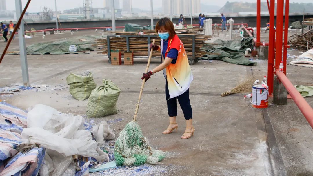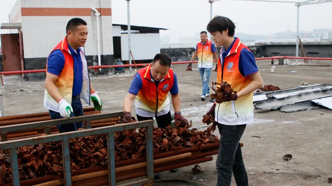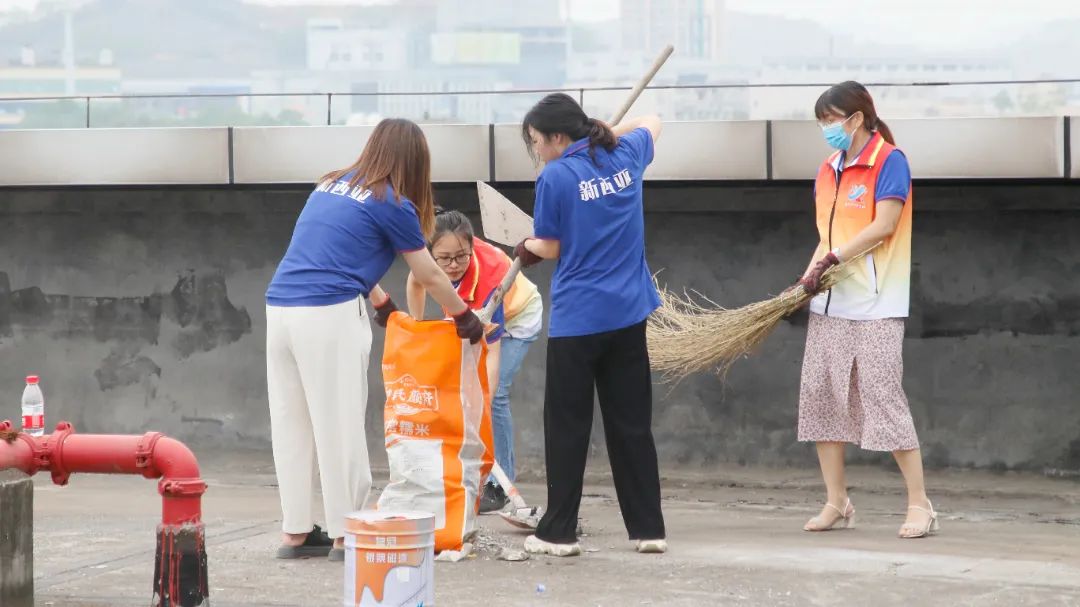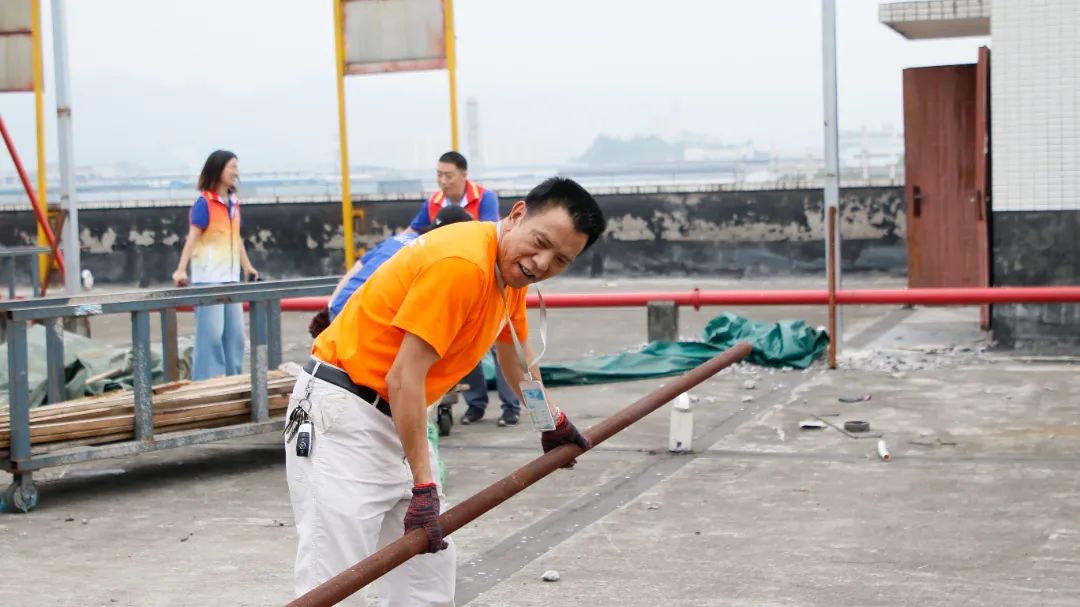 劳动中,大家忘记了自己的年龄、性别,个个不甘落后,抢着去干重活、脏活、累活……劳动的汗水浸湿了大家身上的衣裳,同时也换来了“收获的喜悦”。经过近两个半小时的辛勤劳动,让原来杂乱的厂房顶楼焕然一新。