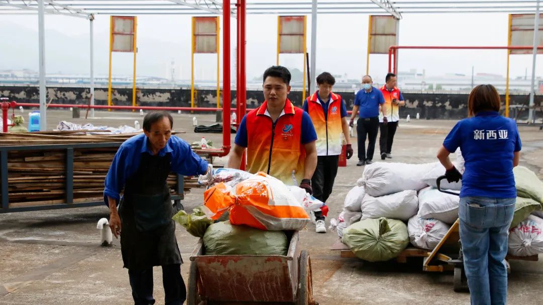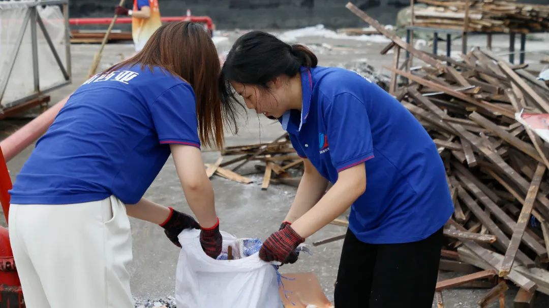 此次义务劳动内容是清理生产厂房楼顶施工区散乱堆放的钢管、钢架、管件、木条、石子等施工物料和垃圾,分类整齐堆放可用的物料,清运不可用的废弃物料和垃圾,改善厂区风貌。