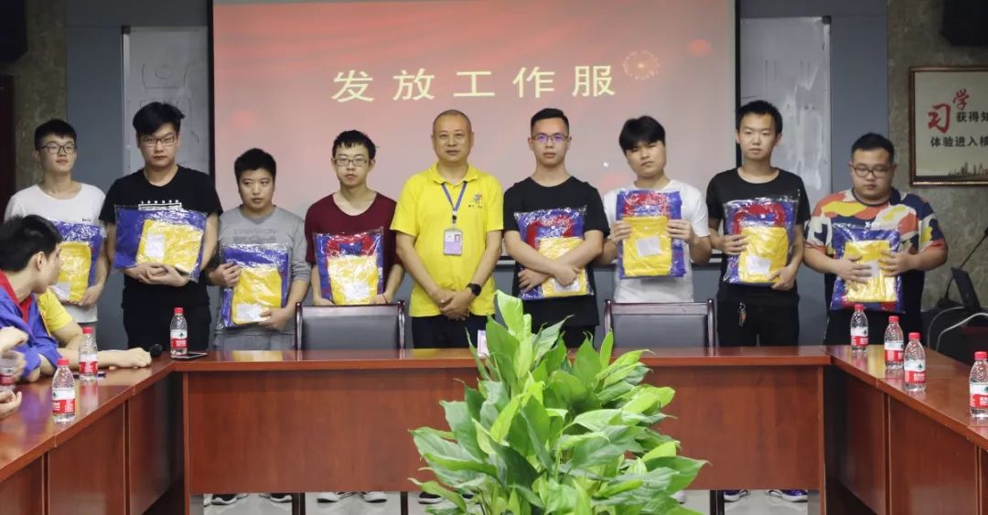 仪式上,公司副总经理周雄亲自向8名新员工发放了工作服。