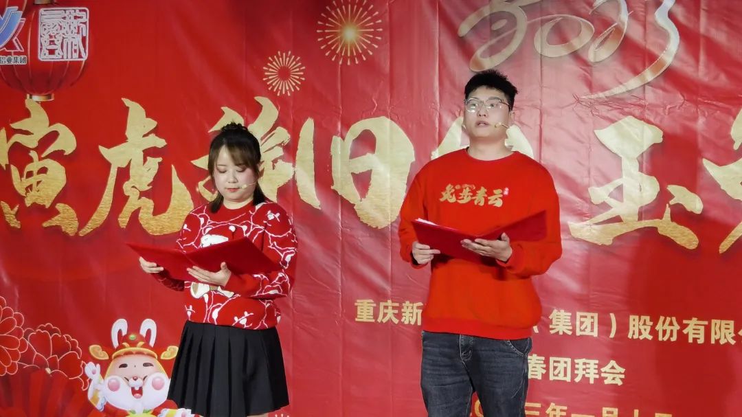 在经久不息的掌声和欢呼声中,团拜会主持人唐春和汤有静闪亮登场!