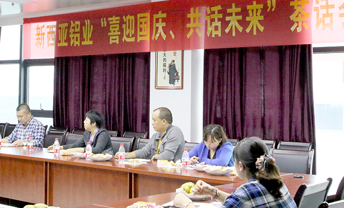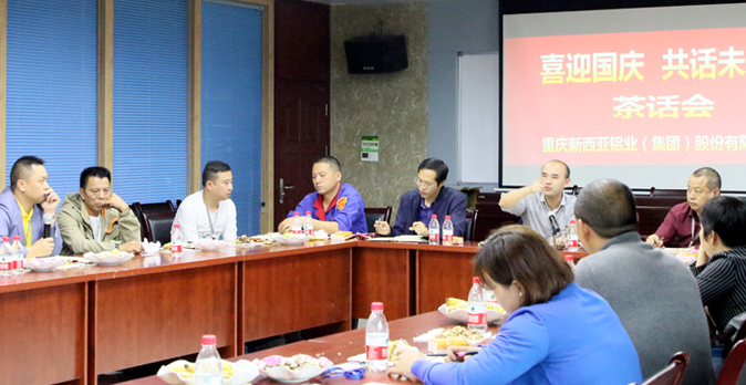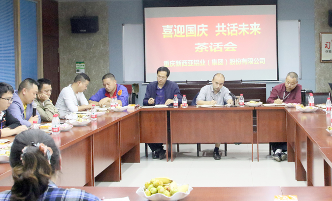 9月30日,重庆西亚铝业集团公司在三楼会议室举行了“喜迎国庆,共话未来”茶话会。公司董事长兼总经理刘斌,副总经理傅明华、周雄及各部门负责人、部分主管28人,齐聚一堂,共话新西亚美好未来。