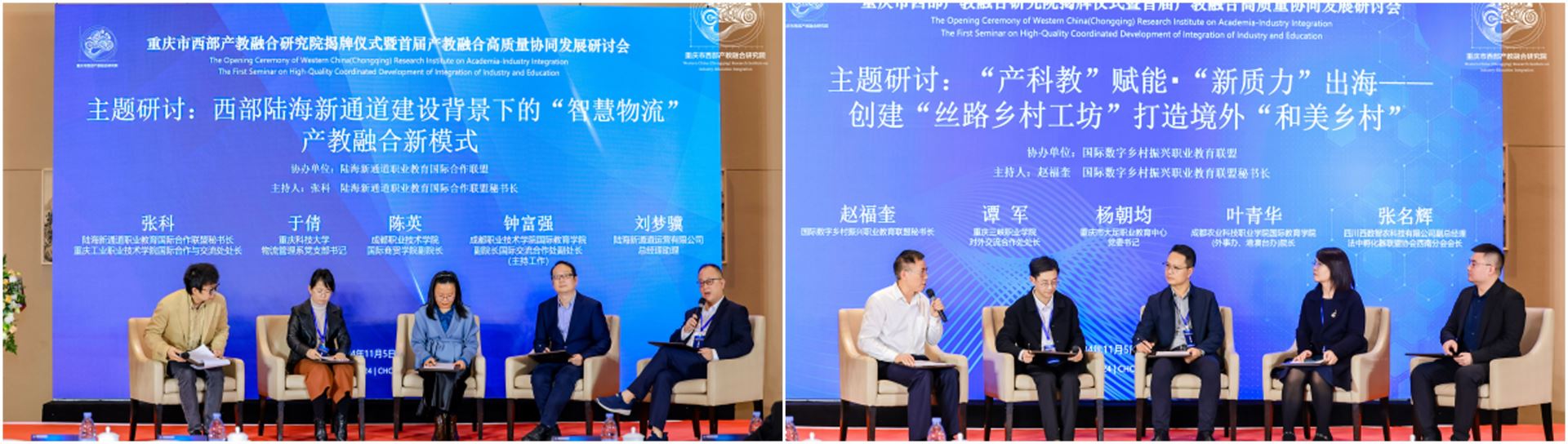 最后,研究院聚焦“强化校企合作、推进产教协同育人”,围绕“智慧物流”“乡村振兴”“专精特新”等主题,携手陆海新通道职业教育国际合作联盟、国际数字乡村振兴职业教育联盟、重庆市赛斯企业管理有限公司联合举办了三场主题对话,为智慧物流产教融合新模式发展、“校企组团”出海服务“丝路数字乡村工坊”,协同育人推动金专业建设,助力人才兴国建设。