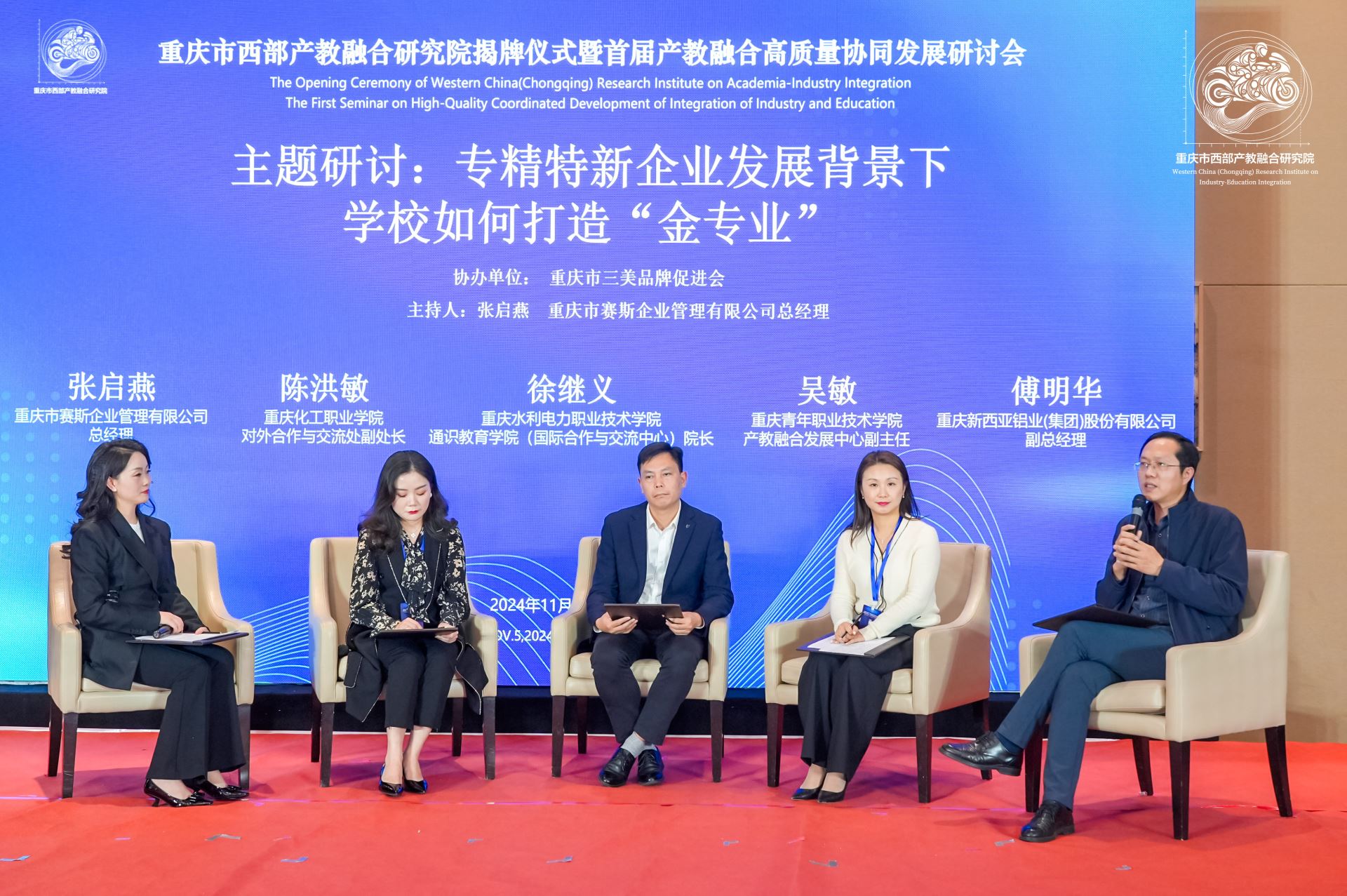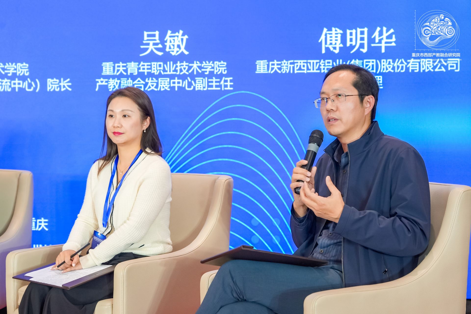 会上,傅明华围绕企业对人才的新特点和新要求,以及在新“双高”背景下,专精特新企业如何促进“金专业”建设方面,与重庆化工职业学院对外合作与交流处副处长陈洪敏、重庆水利电力职业技术学院通识教育学院(国际合作与交流中心)院长徐继义、重庆青年职业技术学院产教融合发展中心副主任吴敏进行了深入探讨。
