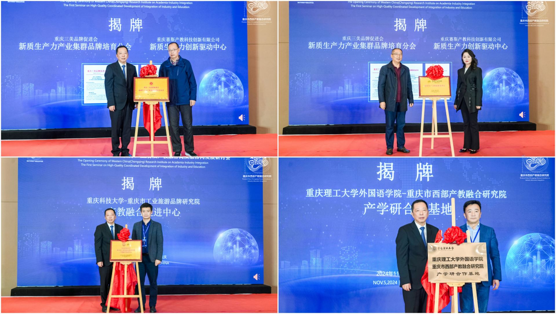 会议中,研究院与重庆三美品牌促进会、重庆赛斯产教科技创新有限公司、重庆科技大学-重庆市工业旅游品牌研究院、重庆理工大学外国语学院等单位举行了系列揭牌活动,通过系列合作成果的达成,充分发挥了研究院搭建产教融合、科教融汇、协同育人的平台作用,激活产学研一体化“强”引擎,为校企合作注入“新”动力。