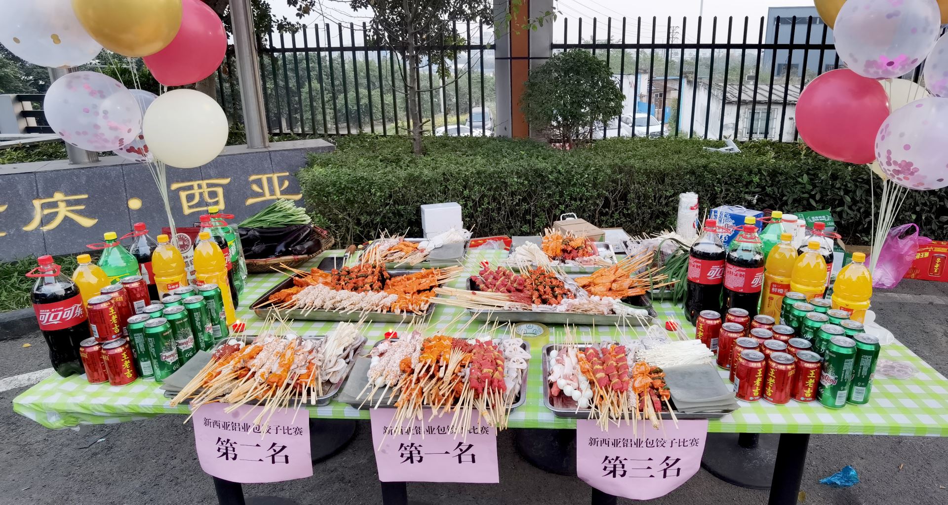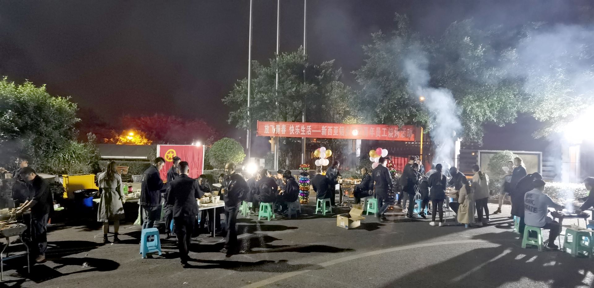 夜色中的新西亚灯火辉煌,“放飞青春、快乐生活——重庆suncitygroup太阳官方网站集团青年员工烧烤活动”横幅悬挂,鲜艳的团旗,五颜六色的彩球,光彩夺目的彩柱,丰富多样的烧烤食材和现场布置有序的活动装备,装扮出了浓浓的活动氛围。